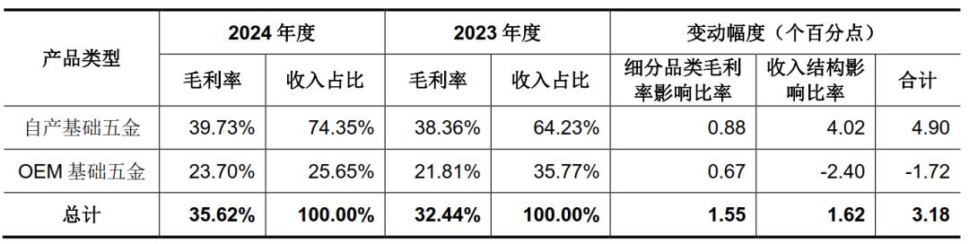 悍高集团认为,2024年度,公司毛利率的增长主要源于基础五金产品毛利率的稳步提升,主要原因系公司基础五金自产比例的不断提高与相关产品主要原材料价格有所下降。