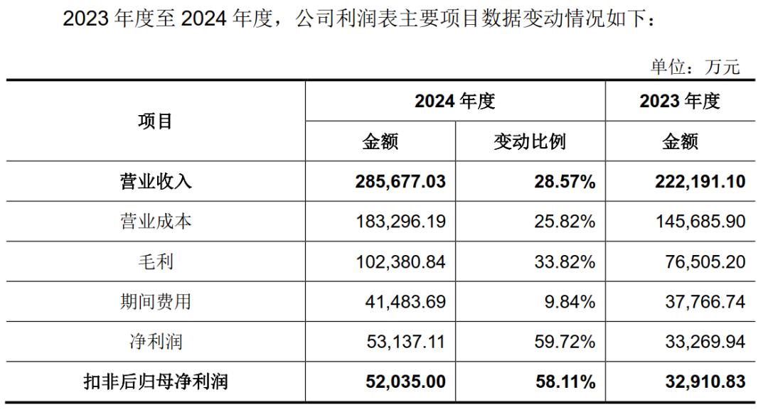 审核中心关注到,悍高集团2024年上半年营业收入为11.85亿元,扣非后归母净利润为1.89亿元;根据审阅报告,2024年营业收入为28.57亿元,扣非后归母净利润为5.20亿元,分别同比增长28.57%、58.11%。