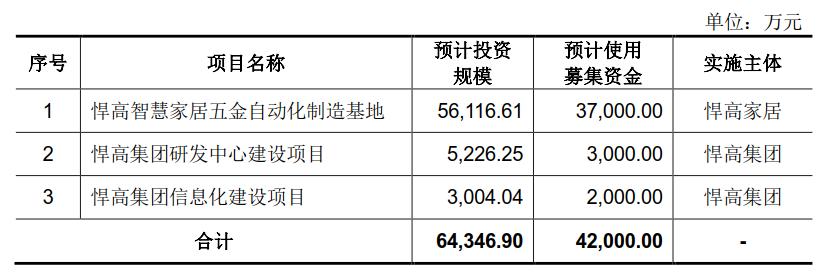 此次IPO,悍高集团拟将募集42,000.00万元,分别用于“悍高智慧家居五金自动化制造基地”“悍高集团研发中心建设项目”“悍高集团信息化建设项目”。