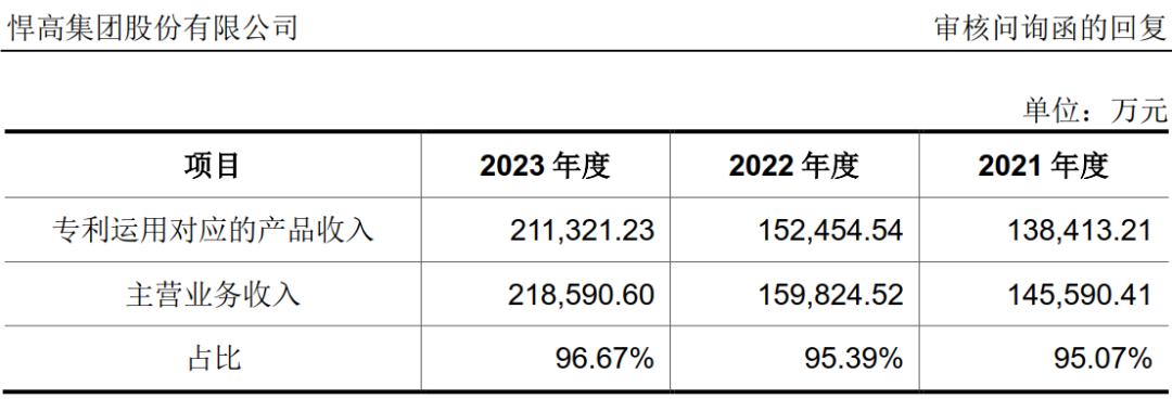 交易所对悍高集团专利方面关注较多的,是专利运用情况及对应产品收入,是否有助于提高悍高集团的产品质量;能否维持自身竞争优势,是否具备较高的技术壁垒,与行业通用技术的差异。