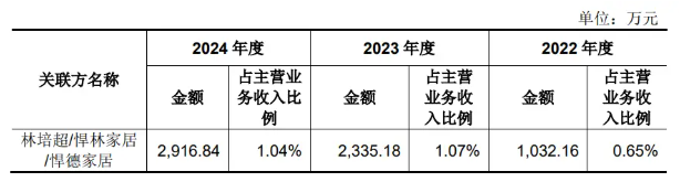 招股书显示,2021年至2023年,悍高集团第一大云商模式销售客户均为佛山悍德家居。悍德家居成立于2021年9月,是实控人欧锦锋之配偶的妹妹林绿苗及其配偶林培超实际控制的企业。同期公司对林培超及经营主体的关联销售金额分别为492.24万元、1032.16万元及2335.18万元,其中向悍德家居的销售金额分别为400.96万元、720.81万元和1,305.07万元,增长十分快速。