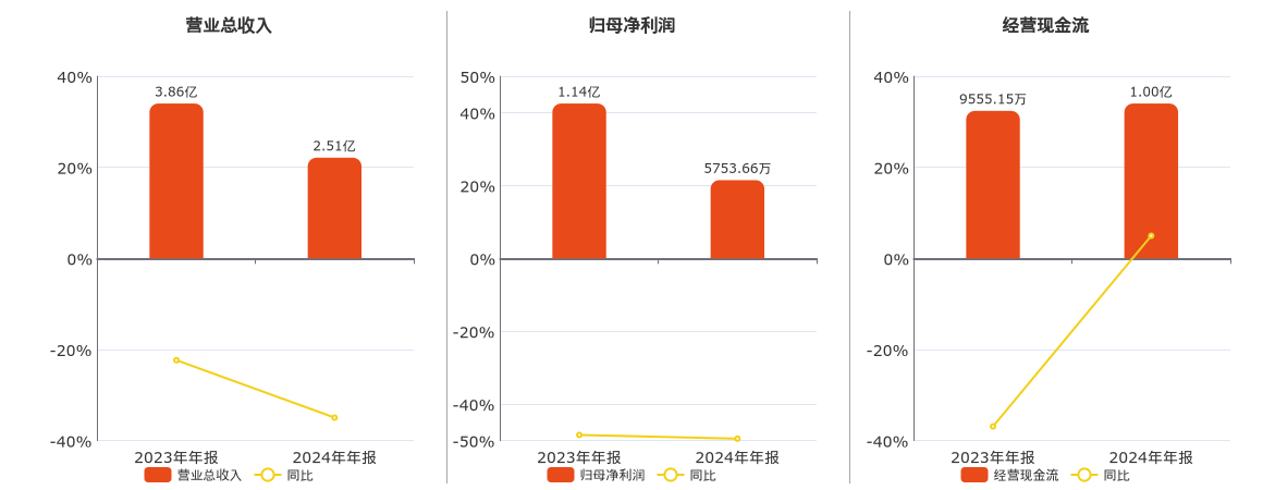 公司营业总收入为2.51亿元,较去年同报告期营业总收入减少1.35亿元,同比较去年同期下降34.96%。归母净利润为5753.66万元,较去年同报告期归母净利润减少5632.26万元,同比较去年同期下降49.47%。经营活动现金净流入为1.00亿元。