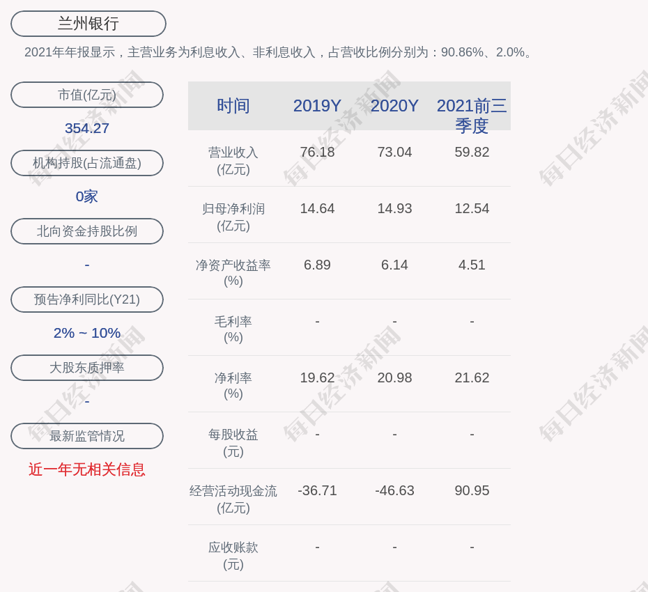 2021年年报显示,兰州银行的主营业务为利息收入、非利息收入,占营收比例分别为:90.86%、2.0%。