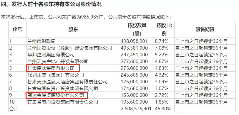 2022年1月14日,兰州银行发布的首次公开发行股票上市公告书显示,盛达集团与盛达资源位列兰州银行前十大股东的第五位和第九位,两者持股比例分别为4.83%和2.72%,且限售期限均为上市后36个月。