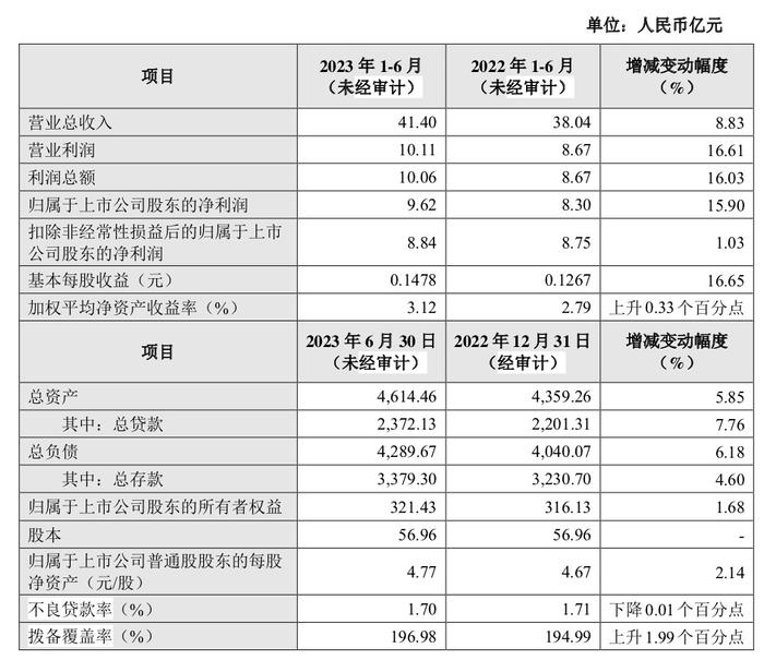 2023年1-6月,兰州银行实现营业总收入41.40亿元,同比增长8.83%;归属于上市公司股东的净利润9.62亿元,同比增长15.90%;扣除非经常性损益后的归属于上市公司股东的净利润8.84亿元,同比增长1.03%;加权平均净资产收益率3.12%,比上年同期上升0.33个百分点。
