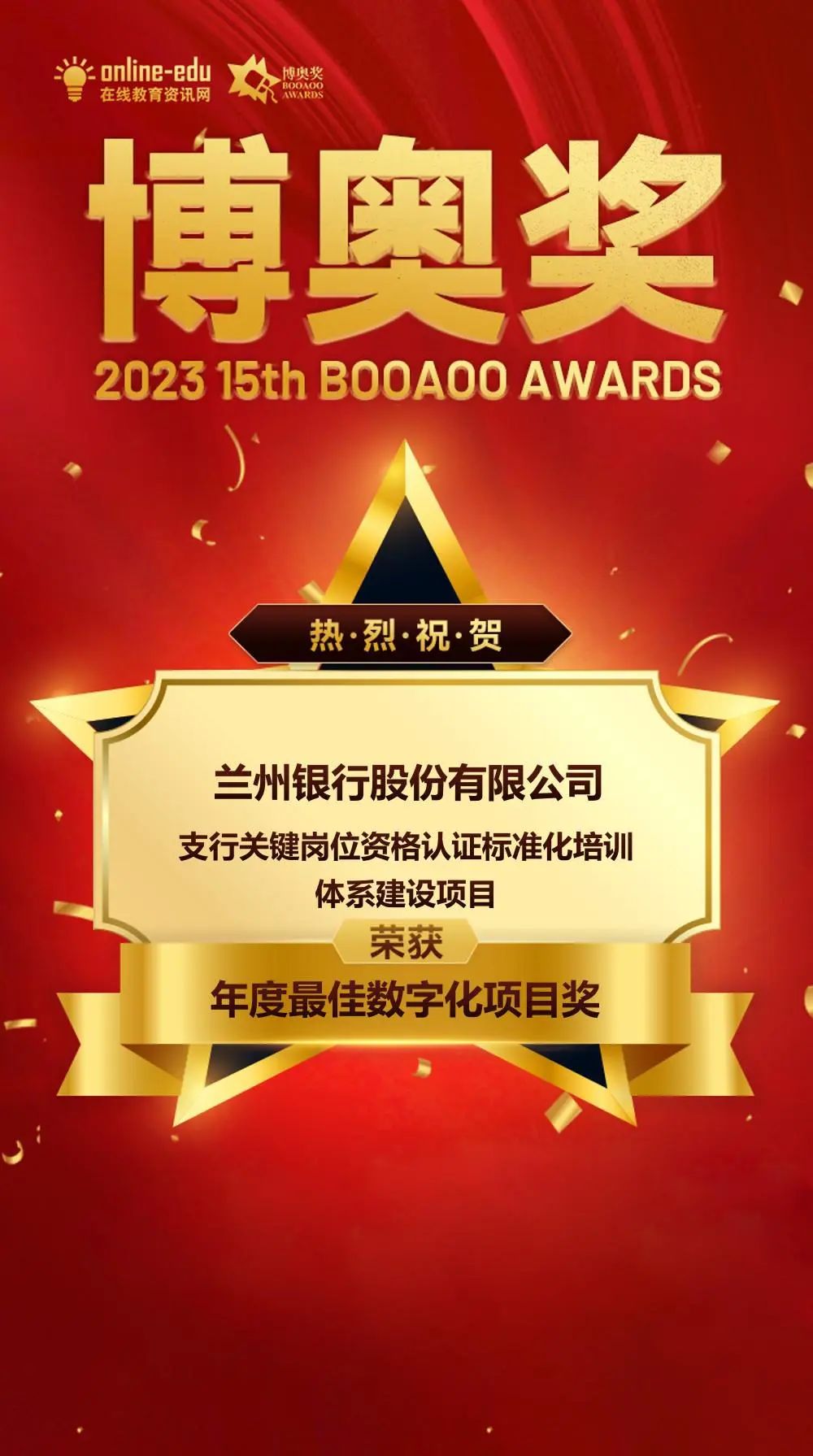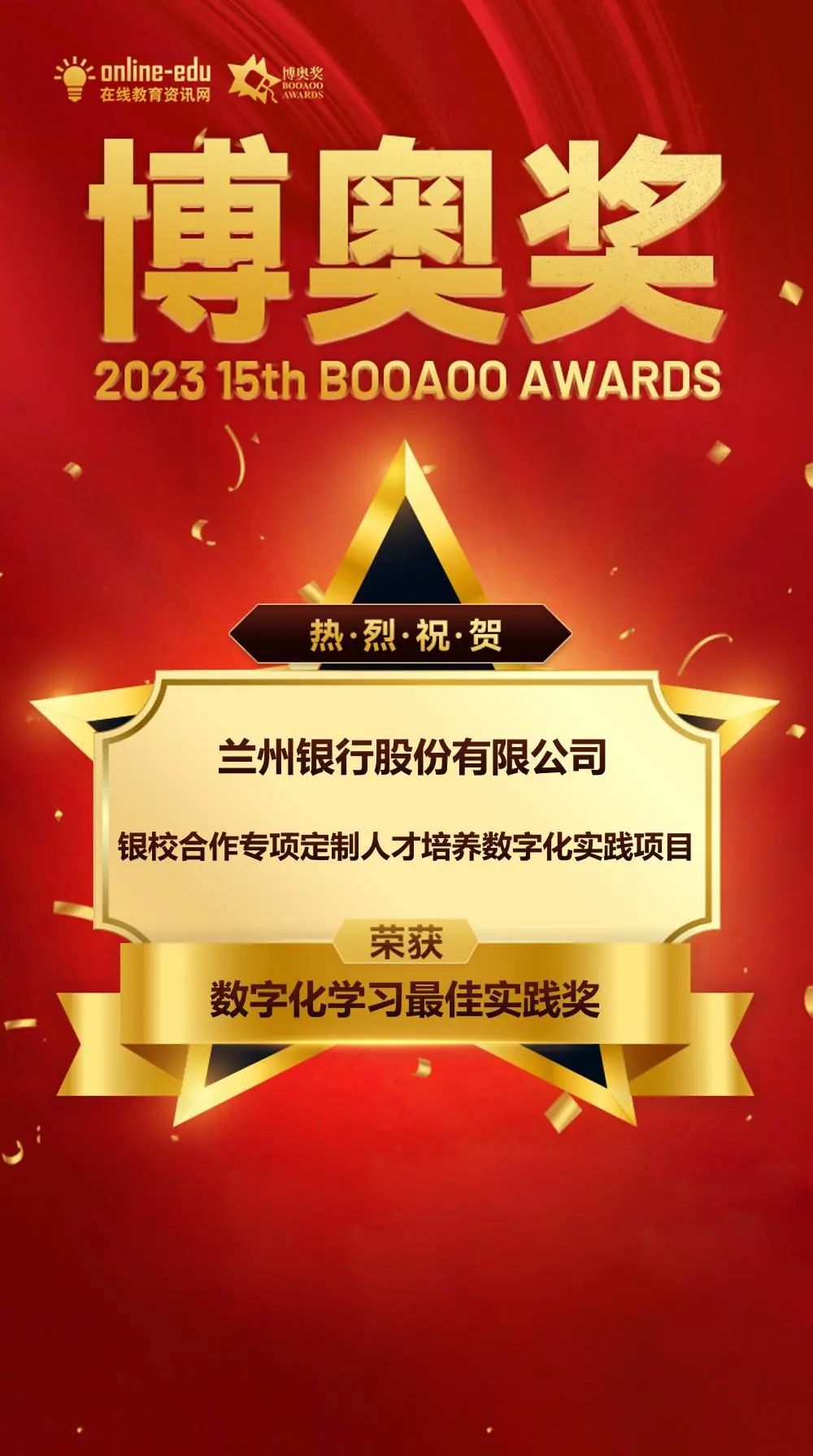近日,兰州银行两个原创培训项目在全国近400家企业的600余项参赛项目中脱颖而出,双双荣获第十五届博奥奖,其中《兰州银行银校合作专项定制人才培养数字化实践项目》荣获“数字化学习最佳实践奖”,《支行关键岗位资格认证标准化培训体系建设项目》荣获“年度最佳数字化项目奖”。这是兰州银行自2019年以来,四度荣获博奥奖,本次评选同时获奖的银行还有中国建设银行、交通银行、浦发银行、南京银行等。
