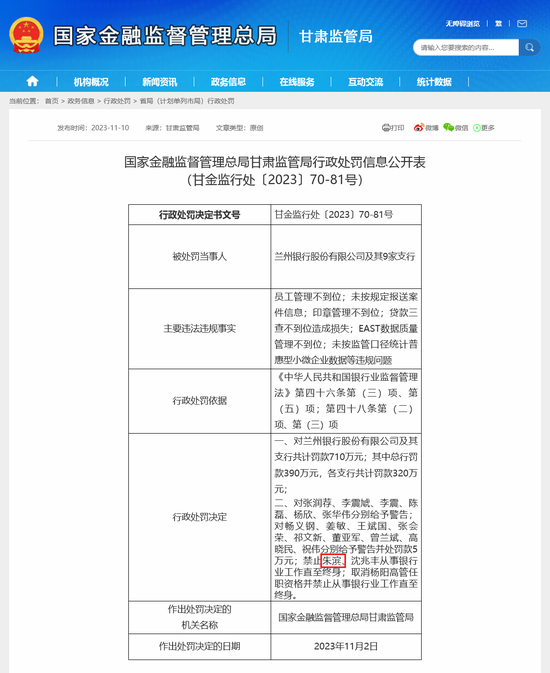 日前,兰州银行股份有限公司及其9家支行因为员工管理不到位;未按规定报送案件信息等违法违规行为被监管处罚,共计被罚款710万元。同时,兰州银行员工朱滨还被监管部门终身禁业。