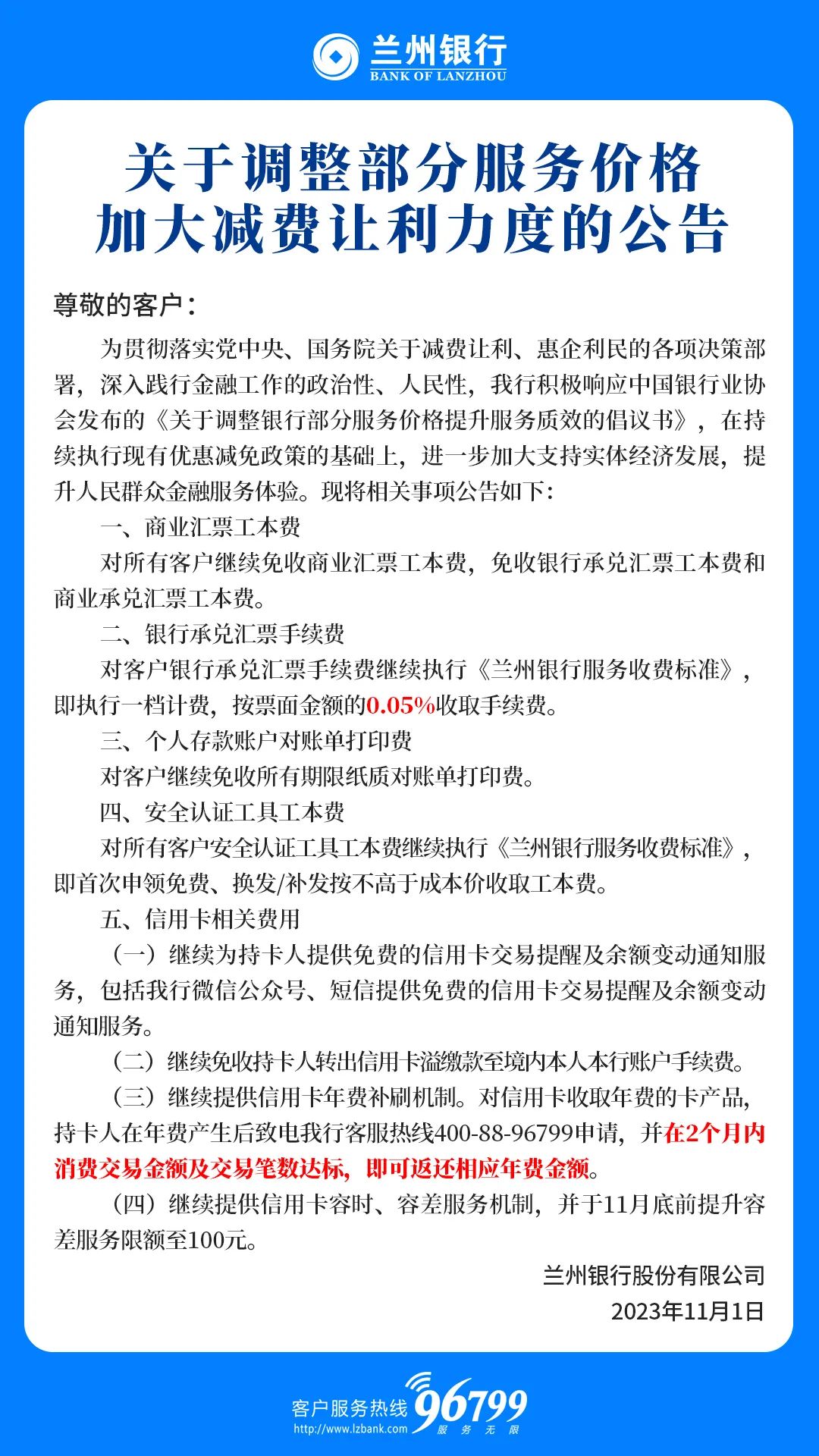 兰州银行关于调整部分服务价格 加大减费让利力度的公告