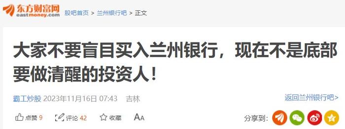 甚至有投资者呼吁道:“大家不要盲目买入兰州银行,现在不是底部要做清醒的投资人!”