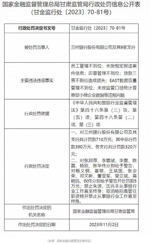 11月11日,国家金融监管总局官网公开一则行政处罚信息公开表,兰州银行及旗下9家分支银行因涉及多项违法违规事实,合计被罚款710万元,其中总行罚款金额为390万元,各分行的罚款金额为320万元,多名相关责任人被警告、罚款或终身禁业。
