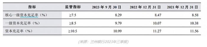 此外,兰州银行资本充足率三项指标均出现下滑态势。2021年末、2022年末、2023年三季度末,其核心一级资本充足率分别为8.58%、8.47%、8.29%。在A股城商行中,三季度末的数值仅排在倒数第二,资本补充的压力有所显现。