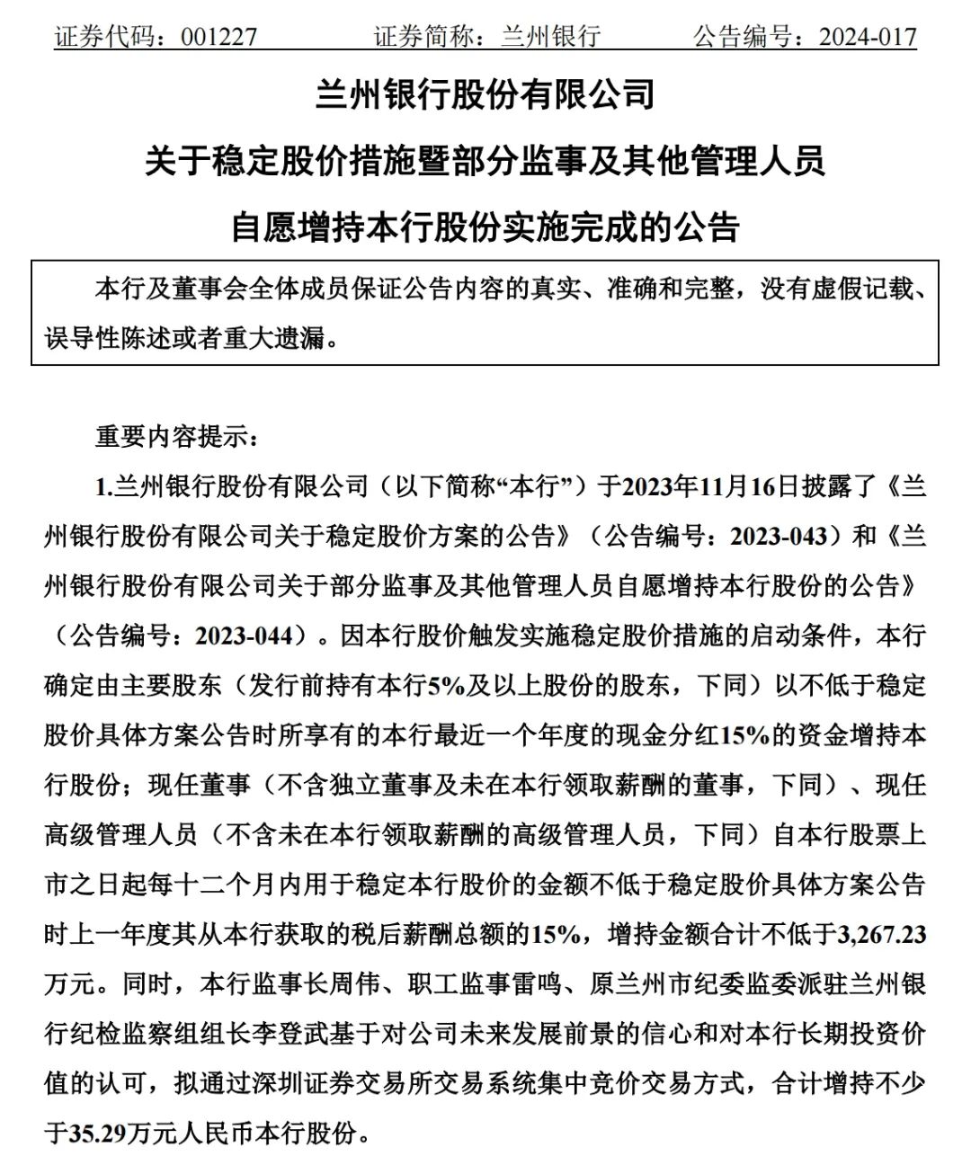 2023年11月,兰州银行的股价最终触发了实施稳定股价措施的启动条件,兰州银行披露了稳定股价的方案,确定主要股东、现任董事、高级管理人员,将现金增持兰州银行股份。