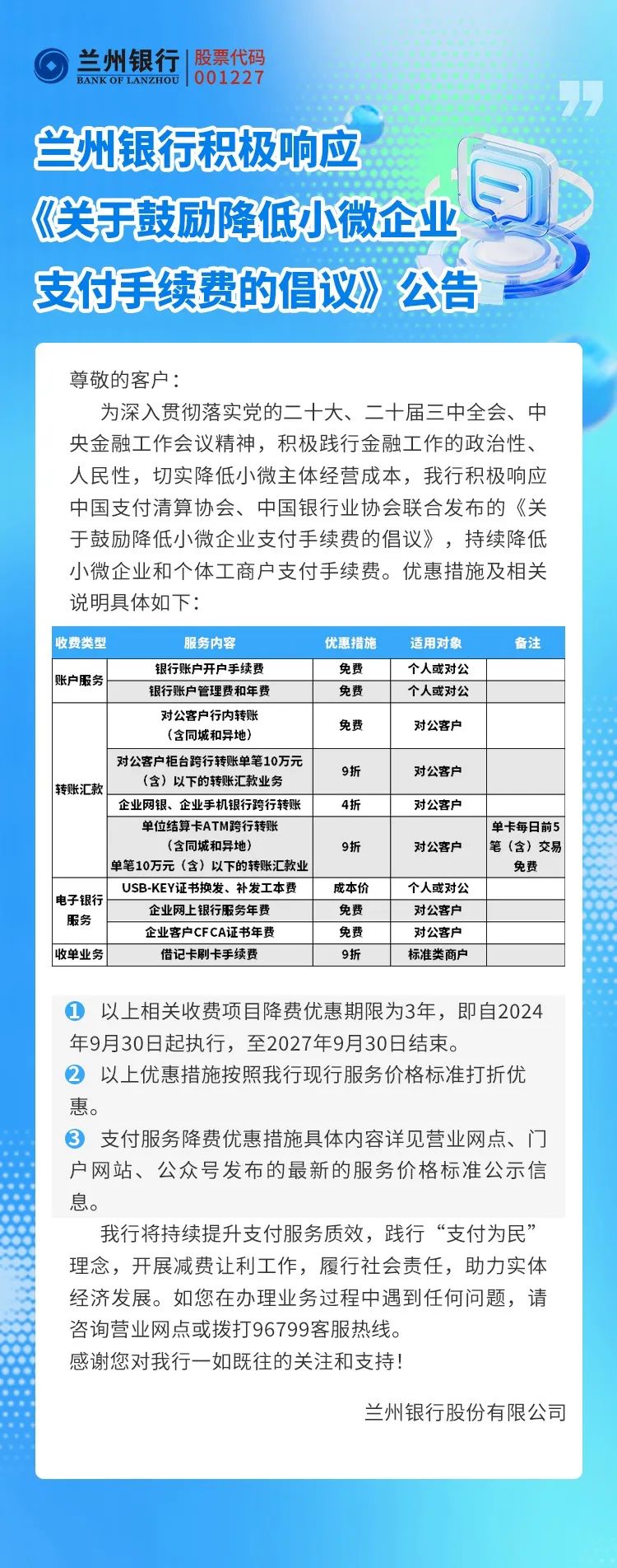 兰州银行积极响应《关于鼓励降低小微企业支付手续费的倡议》公告