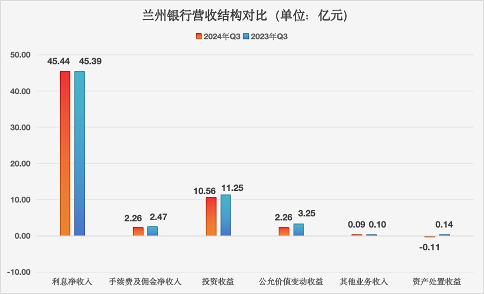 数据显示,该行当期利息净收入为45.44亿元,同比微增0.13%;手续费及佣金净收入为2.26亿元,较上年同期下滑8.54%,投资收益同比下降6.06%至10.56亿元。