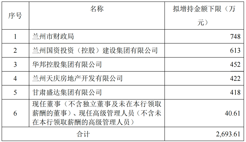 具体来看,此次股价增持主要涉及到的主体分别是:发行前持有兰州银行5%及以上股份的股东;现任董事(不含独立董事及未在本行领取薪酬的董事)、现任高级管理人员(不含未在本行领取薪酬的高级管理人员)。其中,该行前五大股东兰州市财政局、兰州国资投资控股、华邦控股集团、兰州天庆房地产、甘肃盛达集团,各自拟增持金额分别为不低于748万元、613万元、452万元、422万元、418万元。