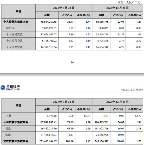 但根据兰州银行披露的2024年半年度报告显示,截至6月30日,该行公司贷款不良率达2.26%。其中,农、林、牧、渔业贷款不良率12.93%,批发和零售业不良率9.65%,制造业不良率2.76%。
