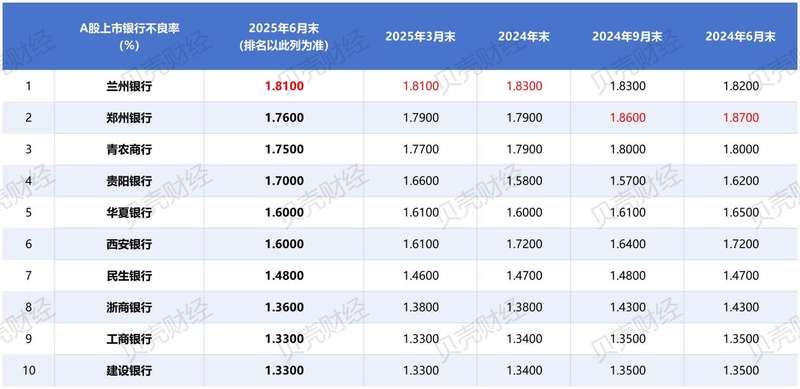 但与财务表现相比,其资产质量指标更引人关注。截至2025年6月末,兰州银行不良贷款率(即不良率)定格在1.81%,较年初收窄0.02个百分点,不良贷款处置取得阶段性进展;但1.81%还是让兰州银行在A股上市银行中成为不良率最高的那家银行,并且这种情况已经持续了三季。