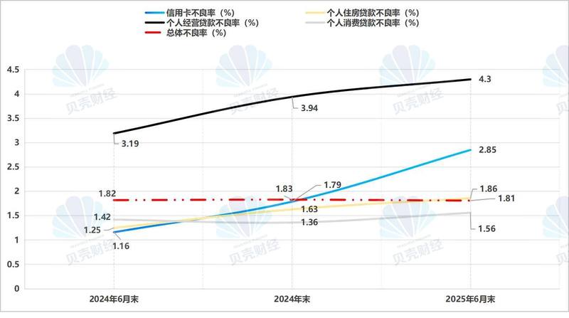 特别对于兰州银行个贷业务中的个人经营贷款与信用卡,其当前不良率持续高位运行的情况更为明显。截至2025年6月末,兰州银行个人经营贷款不良率与信用卡不良率,较上年末分别提升了0.36%与1.06%,而兰州银行个人经营贷款与信用卡业务的不良率,当前分别已经达到4.3%、2.85%,远高于该行的总体不良率。