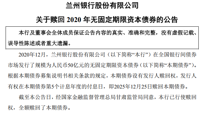 机构之家注意到,该行12月25日对外公告称,经国家金融监管总局甘肃监管局同意,其已全额赎回2020年12月发行的50亿元无固定期限资本债券(即“永续债”)。