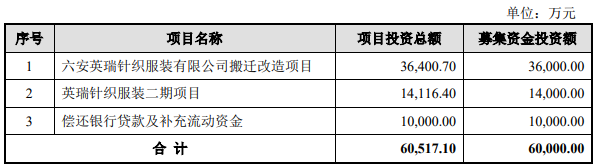 泰慕士实际募资净额较原拟募资少2.17亿元。泰慕士此前在证监会网站披露的2版招股书均显示,公司原拟募资6亿元,拟分别用于“六安英瑞针织服装有限公司搬迁改造项目”、“英瑞针织服装二期项目”、“偿还银行贷款及补充流动资金”。