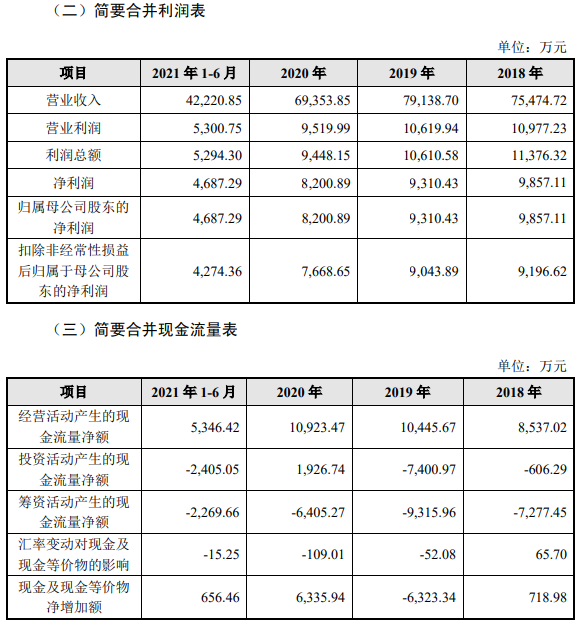 泰慕士2020年营收下滑,净利则在2019年、2020年连降两年。2018年-2020年,泰慕士营业收入分别为7.55亿元、7.91亿元、6.94亿元,归属母公司股东的净利润分别为9857.11万元、9310.43万元、8200.89万元,扣除非经常性损益后归属于母公司股东的净利润分别为9196.62万元、9043.89万元、7668.65万元。