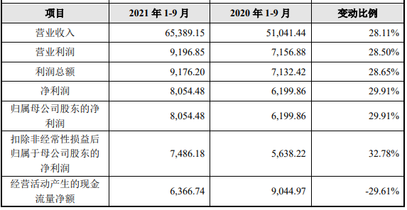 2021年1-9月,泰慕士实现营业收入6.54亿元,同比增加28.11%;归属母公司股东的净利润8054.48万元,同比增加29.91%;扣除非经常性损益后归属于母公司股东的净利润为7486.18万元,同比增长32.78%;经营活动产生的现金流量净额为6366.74万元,同比减少29.61%。