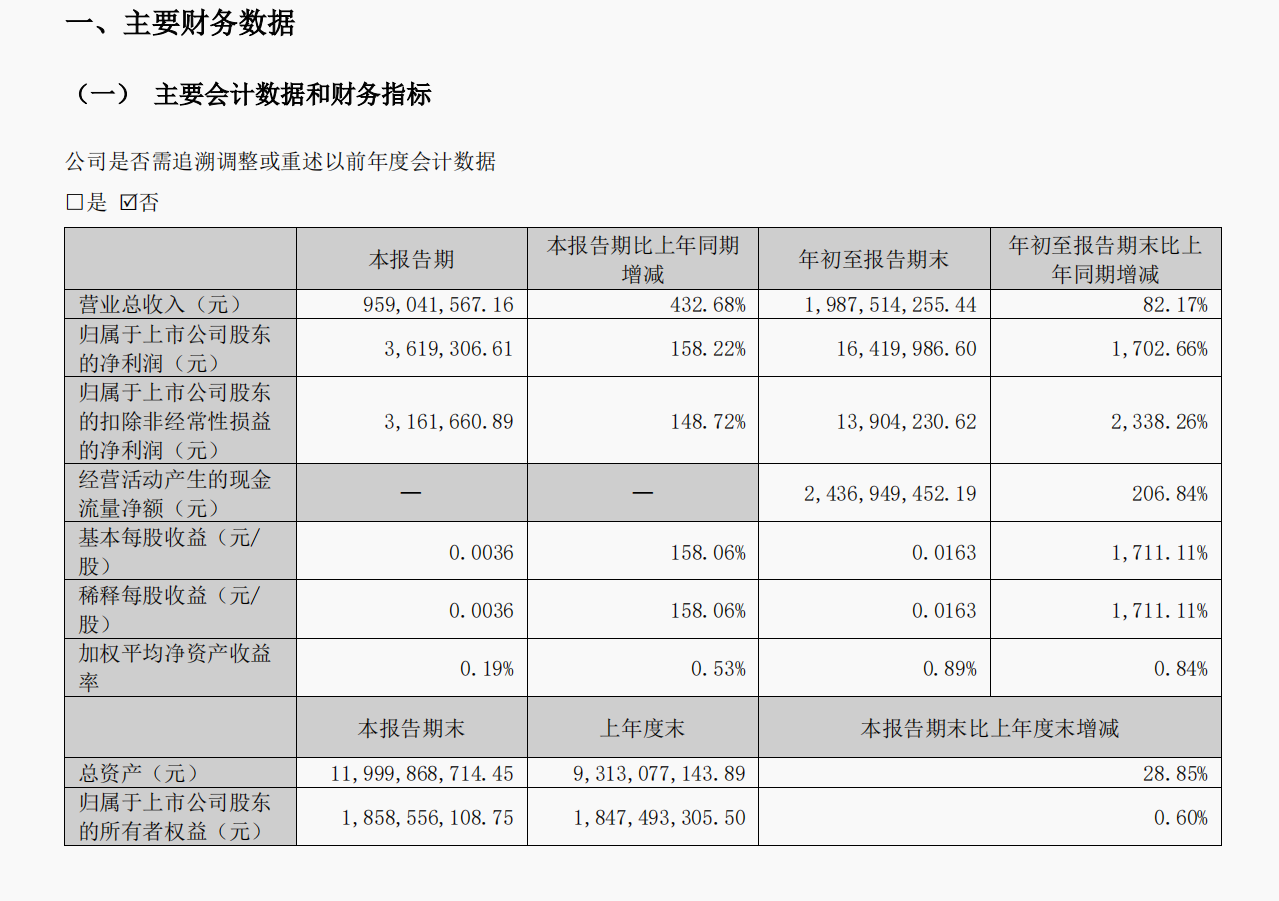 中国网财经10月30日讯今日,上市公司弘业期货(证券代码:001236.SZ)发布业绩报告显示,前三季度其实现营收19.88亿元(1,987,514,255.44元),同比增长82.17%;归属上市公司股东净利润1642万元(16,419,986.60元),同比增长1702.66%;扣非净利润1390.42万元(13,904,230.62元),同比增长2338.26%;基本每股收益0.0163元,同比增长1711.11%。录得总资产120亿元(11,999,868,714.45元),同比增长28.85%。