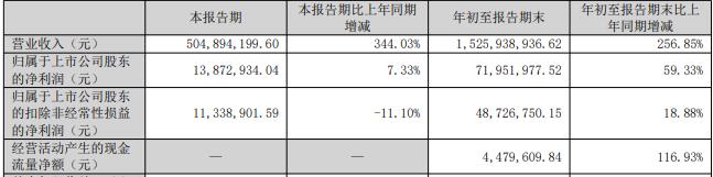 年初至报告期末,公司实现营业收入15.26亿元,同比增长256.85%;归属于上市公司股东的净利润7195.20万元,同比增长59.33%;扣除非经常性损益后的净利润4872.68万元,同比增长18.88%;经营活动产生的现金流量净额447.96万元,同比增长116.93%。