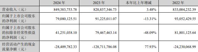 据公司2024年年报,报告期内,公司实现营业收入8.49亿元,同比增长3.48%;归属于上市公司股东的净利润7908.01万元,同比减少13.31%;归属于上市公司股东的扣非净利润为4125.10万元,同比减少48.09%;经营活动产生的现金流量净额为-2840.98万元,2023年为-1.29亿元,2022年为-2423.01万元。
