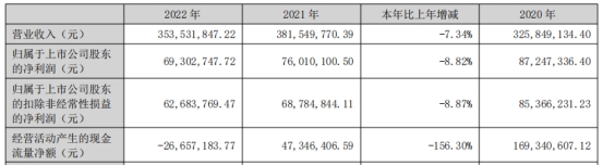 博菲电气4月25日披露2022年年度报告显示,2022年,博菲电气营实现营业收入3.54亿元,同比下降7.34%;归属于上市公司股东的净利润6930.27万元,同比下降8.82%;归属于母公司所有者的扣除非经常性损益的净利润6268.38万元,同比下降8.87%;经营活动产生的现金流量净额-2665.72万元,同比下降156.30%。