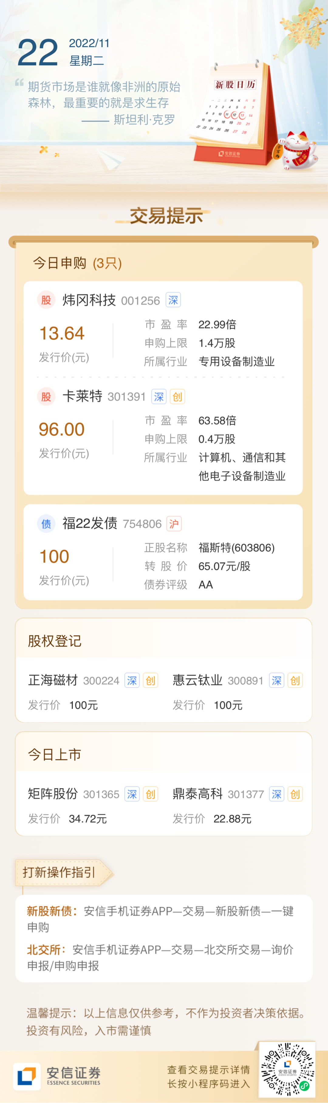【今日新股】炜冈科技、卡莱特;祝好运!