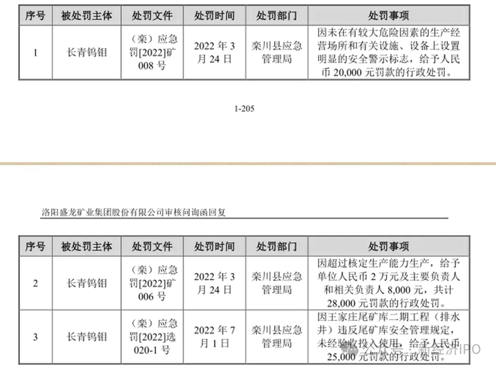 此外,2022 年3月,长青钨钼作为盛龙有限的控股子公司存在实际开采规模超过采矿许可证证载规模的情况,并受到栾川县应急管理局行政处罚,所处罚金为2.8万元。此外,2022年3月,长青钨钼因未在有较大危险因素的生产经营场所和有关设施、设备上设置明显的安全警示标志,被栾川县应急管理局给予20000元罚款的行政处罚。2022年7月,长青钨钼因王家庄尾矿库二期工程(排水井)违反尾矿库安全管理规定,未经验收投入使用,被栾川县应急管理局给予25000元罚款的行政处罚。2022年年末,盛龙股份选择将长青钨钼剥离合并范围。