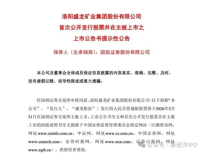 根据深交所公告,洛阳盛龙矿业集团股份有限公司(盛龙矿业)发行的人民币普通股股票将于2026年3月31日在深圳证券交易所主板上市。盛龙矿业上市申请2025年5月获得受理,分别于11月12月完成两轮问询,12月26日提交注册。2026年1月7日注册生效,上市之路可以说是非常顺利。