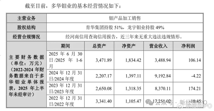 然而,多华钼业的经营业绩并不理想。数据显示,2022-2025年上半年,多华钼业毛利率分别为2.89%、13.22%、4.09%和7.54%。2022年-2024年,多华钼业实现营收分别为17,251.02万元、8,370.11万元和9,192.84万元,营收规模处于缩水状态。同期,公司实现净利润分别为-10.45万元、174.21万元和-4.22万元。过去三年之中,多华钼业有两年处于亏损状态。