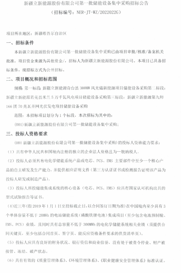 新疆立新能源若羌县米兰5万千瓦风电项目储能设备采购;第三标段:新疆立新能源第九师166团70兆瓦并网光伏发电项目储能设备采购。本次招标为其中的新疆立新能源股份有限公司第一-批储能设备集中采购。