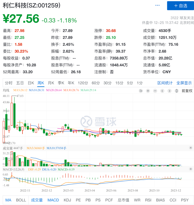随后在一年多的时间内,利仁科技的股价始终在30元/股左右徘徊,截至2023年12月25日午盘收盘,利仁科技报27.56元/股,总市值为20.28亿元。