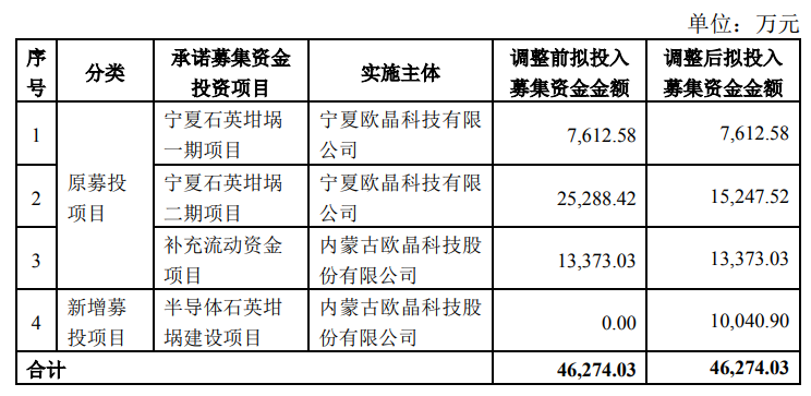 欧晶科技表示,根据公司战略发展的需要,为进一步提升公司研发实力,更好地满足公司未来发展需要,本着公司效益最大化和股东利益最大化的原则,经公司管理层审慎研究讨论,拟变更部分募投项目,从原募投项目“宁夏石英坩埚二期项目”募集资金投资额 25,288.42 万元中调出募集资金 10,040.90 万元,用于新增募投项目“半导体石英坩埚建设项目”建设,占公司向不特定对象发行可转换公司债券募集资金总额的 21.36%。