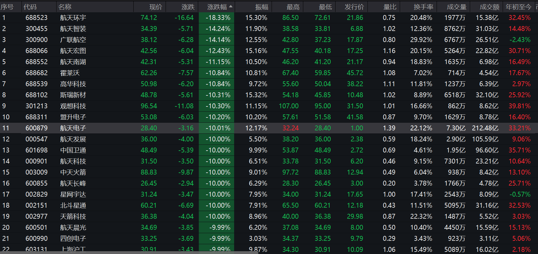 1月13日,商业航天概念股集体跳水。截至收盘,商业航天主题指数(866517.WI)下跌5.83%,盘中一度跌超8%,航天电子(600879.SH)、航天科技(000901.SZ)、北斗星通(002151.SZ)、航天长峰(600855.SH)、中天火箭(003009.SZ)等十余股跌停。
