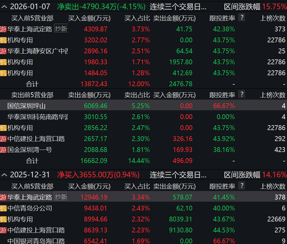 龙虎榜数据显示,在2025年12月29日至12月31日及2026年1月5日至1月7日期间,抄新一族再度出手,分别大举净买入1.24亿元及4268.12万元。