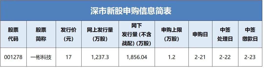 2023年2月21日,宁波一彬电子科技股份有限公司(简称:一彬科技)将通过深交所网下发行电子平台和交易系统发行新股,具体信息如下。