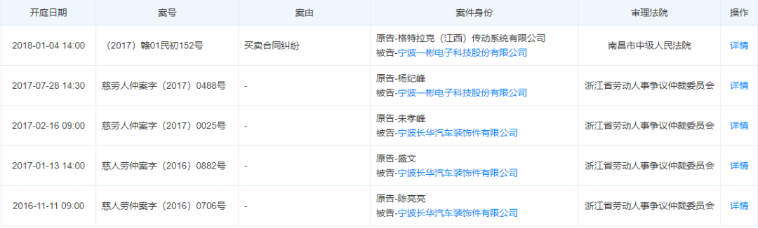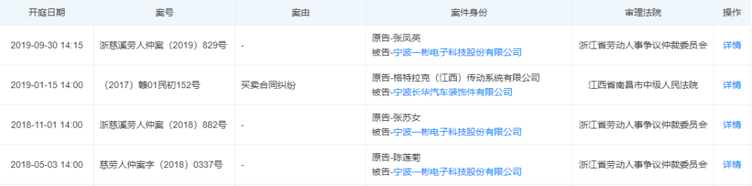 另外,一彬科技投资的宁波翼宇汽车零部件有限公司被起诉的开庭公告有多条,其中有8条是涉及到劳动纠纷的。