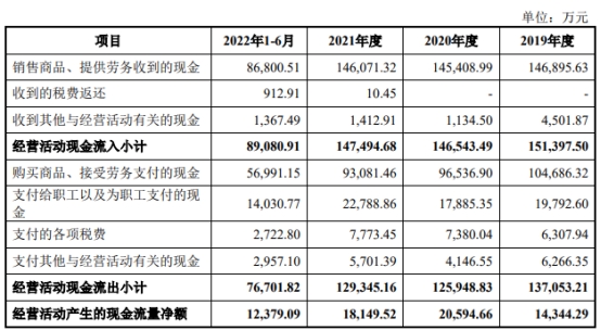 2019年至2022年1-6月,一彬科技经营活动产生的现金流量净额分别为14,344.29万元、20,594.66万元、18,149.52万元、12,379.09万元,销售商品、提供劳务收到的现金分别为146,895.63万元、145,408.99万元、146,071.32万元、86,800.51万元。