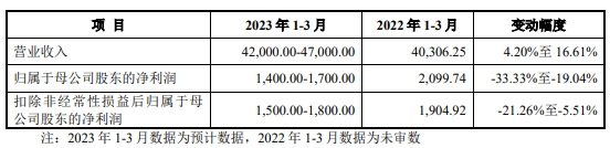 结合公司的实际经营情况,经管理层初步测算,公司2023年1-3月的营业收入预计为42,000.00-47,000.00万元,变动幅度4.20%至16.61%;归属于母公司股东的净利润预计为1,400.00-1,700.00万元,变动幅度-33.33%至-19.04%;扣除非经常性损益后归属于母公司股东的净利润预计为1,500.00-1,800.00万元,变动幅度-21.26%至-5.51%。