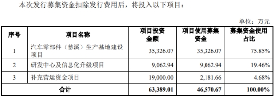 一彬科技本次发行募集资金总额为52,586.78万元,扣除发行费用后,募集资金净额为46,570.67万元。一彬科技于2023年2月20日披露的招股说明书显示,本次首次公开发行股票所募集的资金扣除发行费用后,将用于汽车零部件(慈溪)生产基地建设项目、研发中心及信息化升级项目、补充营运资金项目。