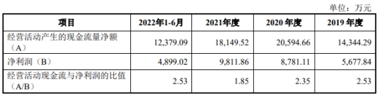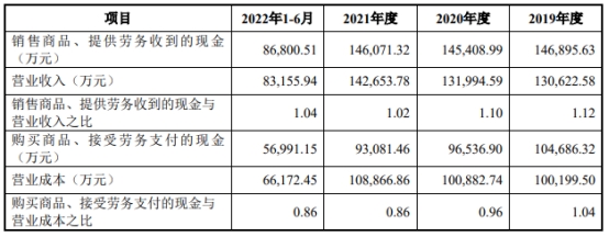 2019年至2022年1-6月,一彬科技的收现比分别为1.12、1.10、1.02、1.04,净现比分别为2.53、2.35、1.85和2.53。