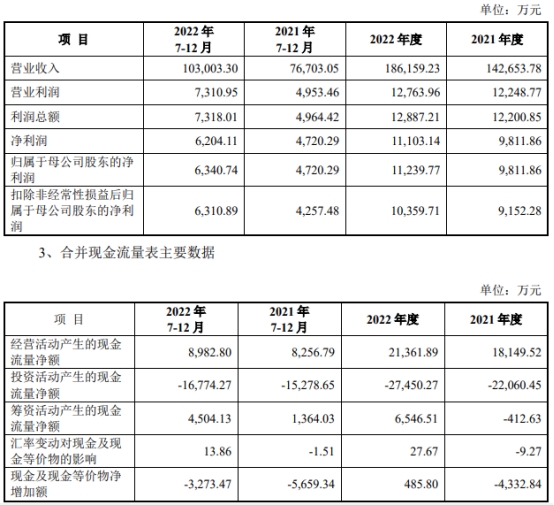 公司2022年度营业收入186,159.23万元,2022年7-12月营业收入103,003.30万元,与上年同期相比分别增长30.50%和34.29%;公司2022年度扣除非经常性损益后的归属于母公司股东的净利润为10,359.71万元,2022年7-12月扣除非经常性损益后的归属于母公司股东的净利润为6,310.89万元,与上年同期相比增长13.19%和48.23%;2022年度和2022年7-12月,经营活动产生的现金流量净额21,361.89万元和8,982.80万元,分别同比增加3,212.37万元和726.01万元。
