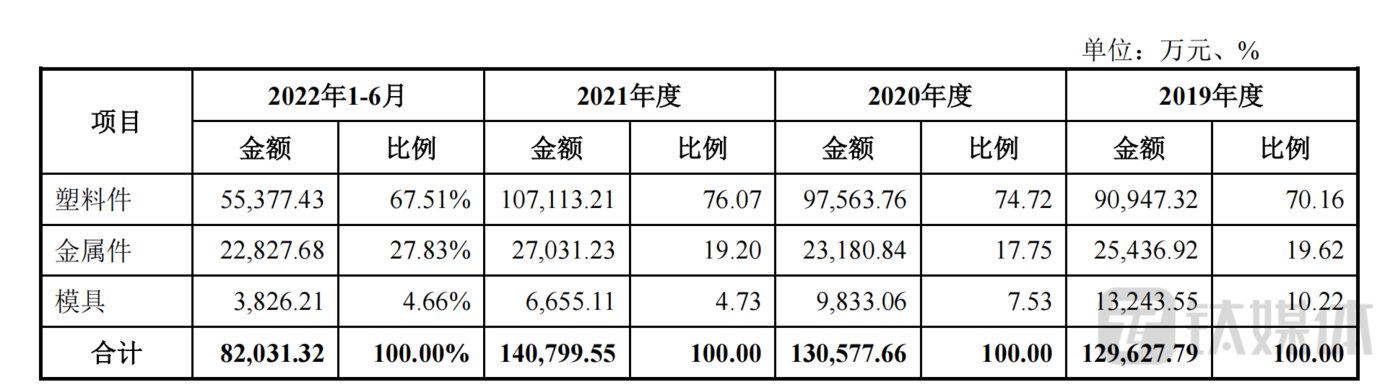 招股说明书显示,2021年,公司主营业务收入按产品类型可分为三大板块,分别为塑料件(10.71 亿元,76.07%)、金属件(2.70 亿元,19.20%)、模具(0.67 亿元,4.73%)。从数据可以看出,报告期间公司塑料件一直为公司的主要产品,收入占比维持在70%左右。