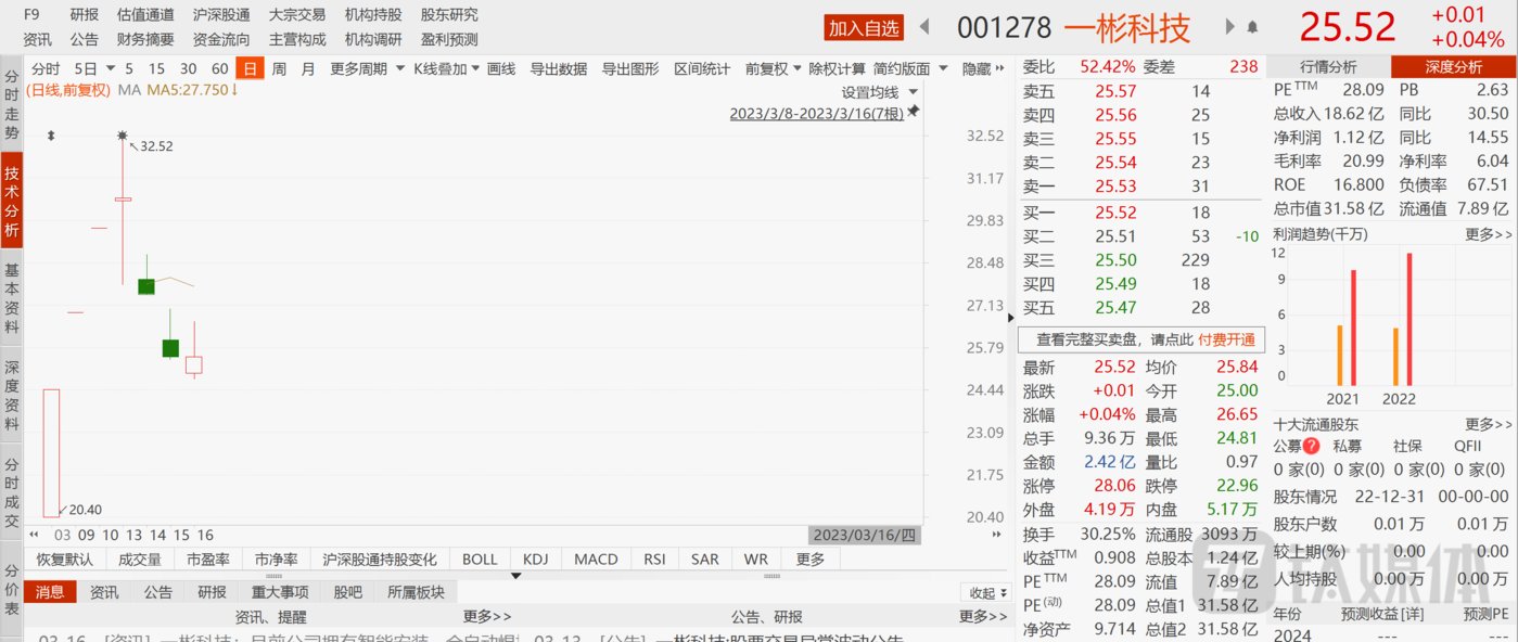 上市已久的汽车零部件股受到影响,最近上的新股也受到波及。一彬科技(001278.SZ)在上市四天后就打开涨停板,并且连续遭遇两个跌停板,截至3月16日,股价收报25.52元,总市值31.58亿元。