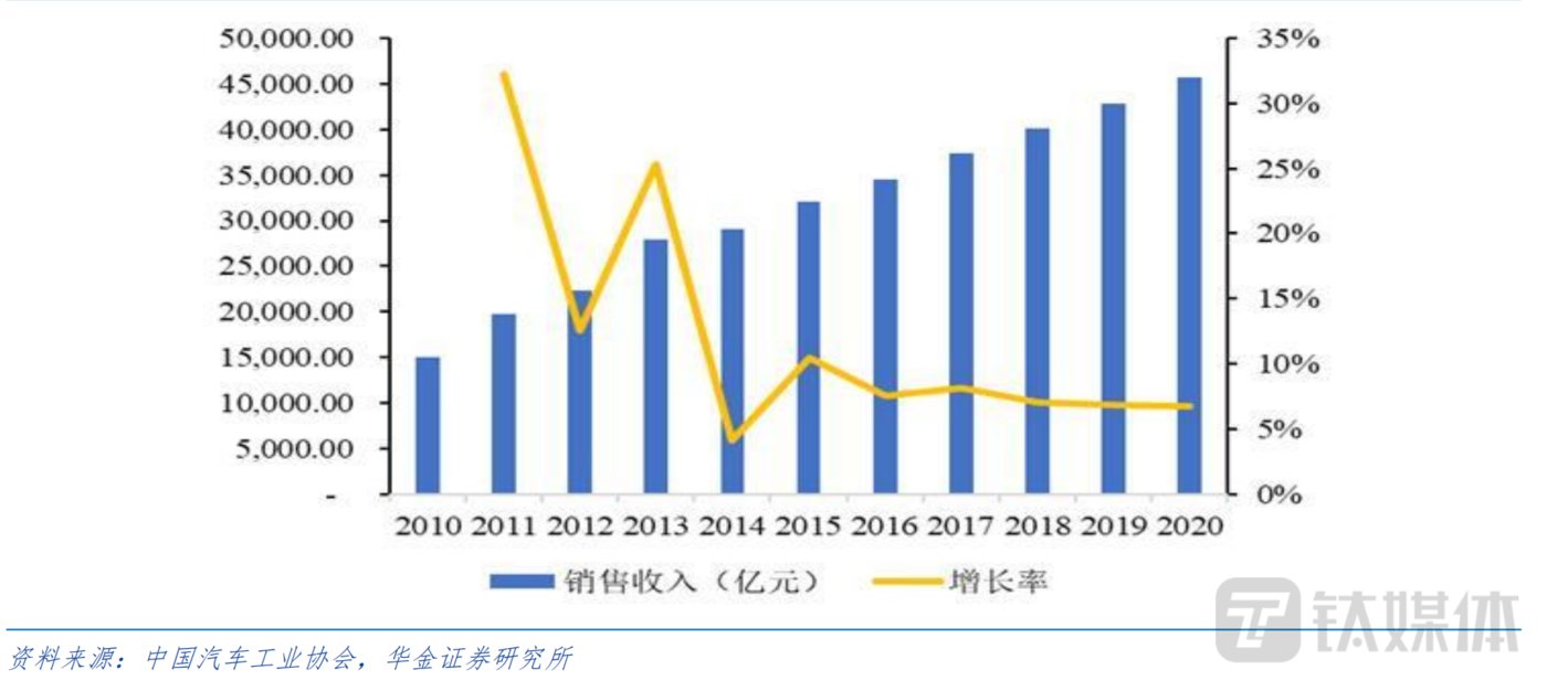 我国汽车零部件行业销售收入由2010年的1.5万亿元增至2020年的4.57万亿元,年均复合增速为19.65%,显著高于我国GDP的年均增速。根据国家统计局数据显示,2020年我国汽车零部件制造业项下规模以上企业的主营业务收入为3.63万亿元,同比增长1.55%。