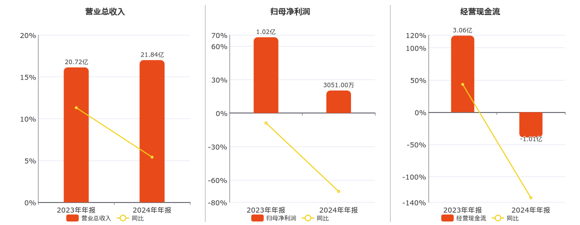 公司营业总收入为21.84亿元。归母净利润为3051.00万元,较去年同报告期归母净利润减少7193.32万元,同比较去年同期下降70.22%。经营活动现金净流入为-1.01亿元,较去年同报告期经营活动现金净流入减少4.07亿元,同比较去年同期下降132.90%。